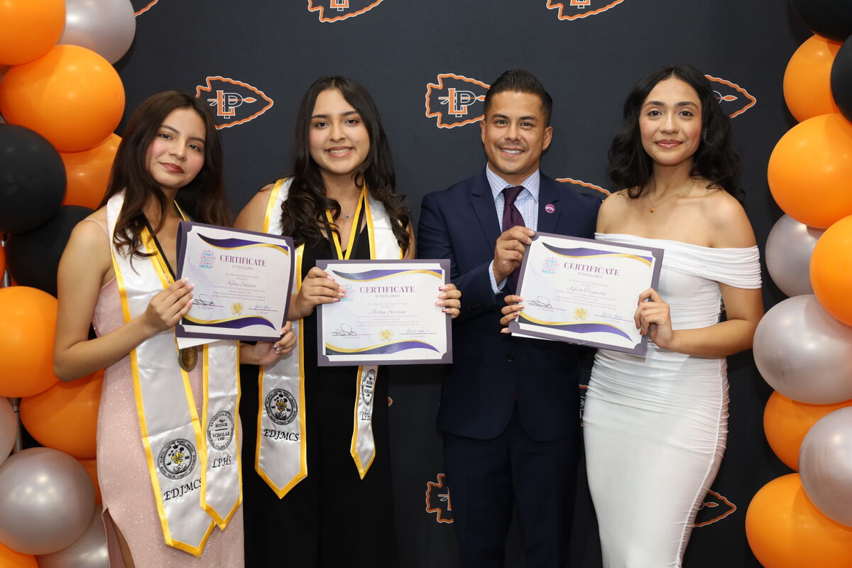 HLPUSD_SENIORAWARDSNIGHT4: Three La Puente High School seniors receive the 2024 Victor De La Cruz Alvarez Memorial Scholarship during a Senior Awards Night presented by Sparks Middle School Principal Dr. David Nieto and La Puente High School Principal Dr. Lisa Lopez on May 14.