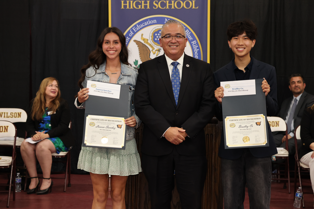 HLPUSD_SENIORAWARDSNIGHT2: Glen A. Wilson High School seniors Lauren Sanchez and Bradley Co receive the 2024 State of the District Scholarship presented by Superintendent Dr. Alfonso Jiménez during a Senior Night ceremony on May 16.
